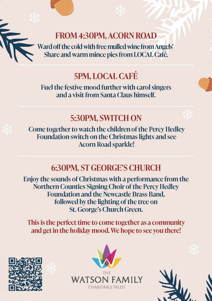 5.30pm, switch on: Come together to watch the children of the Percy Hedley Foundation switch on the Christmas lights and see Acorn Road sparkle!